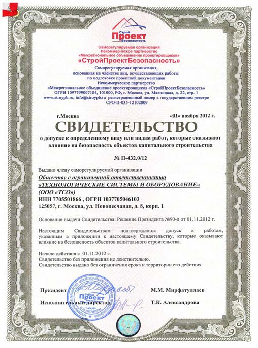 ООО «ТСО» является членом саморегулируемой организации, основанной на членстве лиц, осуществляющих строительство - «Некоммерческая саморегулируемая организация «СтройПроектБезопасность» и имеет