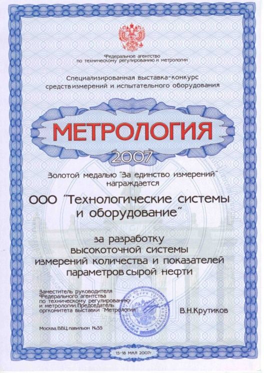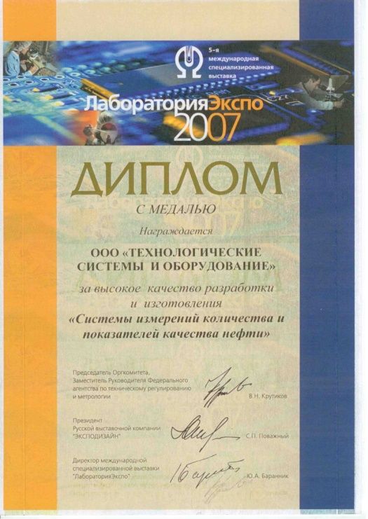 По результатам деятельности ООО «ТСО» награждено дипломами за высокое качество разработки и изготовления СИКН.
