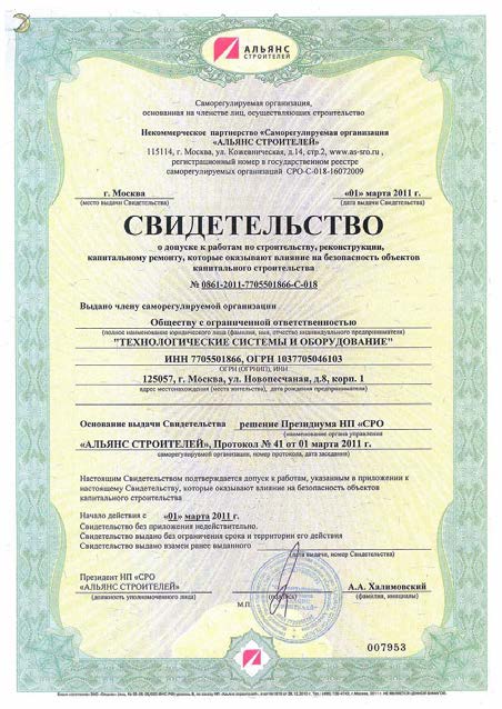 ООО «ТСО» является членом саморегулируемой организации, основанной на членстве лиц, осуществляющих строительство - «Некоммерческая саморегулируемая организация «Альянс строителей» и имеет Свидетельство о допуске к работам по строительству, реконструкции, капитальному ремонту, которые оказывают влияние на безопасность объектов капитального строительства.